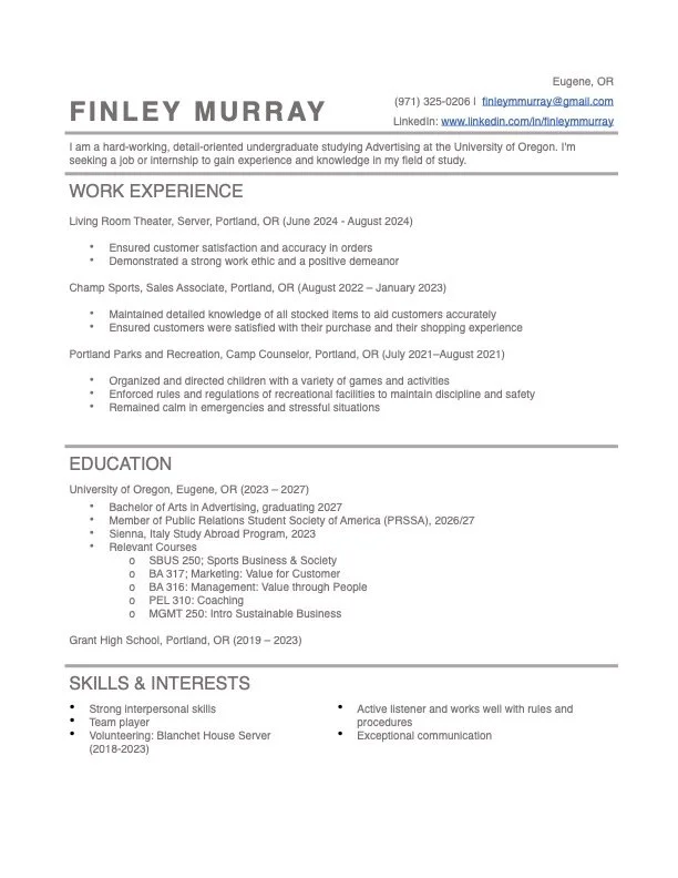 Here is my resume, which includes my previous work experience, clubs and memberships, education, and skills. Below is a button linking to a downloadable version of my resume.